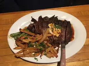 This is an old haunt of mine, used to go here for lunch quite a bit. Wanted to revisit and figured this was a good time to go. Glad we went. The place pretty much looks the same. Could use a bit of sprucing -- but the food is good. Started with chowder, very nice, herbs and a thinner broth. Tons of clams. Then the chopped salad with cherries and nuts. Good dressing. Steak was well cooked and seasoned.Served with twice fried fries, and collard greens. Both sides were good. Ahi was well seasoned but was overcooked. it should have been pink--served with broccoli fried rice and ginger. Again tasty. Just wish it had been less done. Dessert was pot de creme and a cheesecake with caramel and sea salt. Nice textures and good flavor on both. Staff was very nice, she was a busy girl and did a good job of getting our food out and making the drinks. Comfortable place, not fancy, but tasty food as I remember.