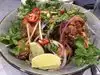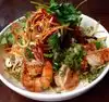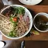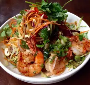 Three of us enjoyed the green papaya salad with peanuts and small dried shrimp; fresh spring rolls with shrimp and pork; lemongrass beef with noodles; and pork, shrimp and crab dumplings in sauce with spinach- also likes the small cucumber pickles. The lemonade with ginger and mint was refreshing. Good service. A bit noisy. Unfortunately, the hip hop music on the TV in the bar area did not contribute to our dining pleasure.