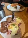 Had eggs Benedict for the very first time, sauce on side. It was very good, with fresh straight from farm, locally sourced ham, sausage, vegetables, etc. Nice variety of options since everything depends on seasonal availability. Pancakes were very tasty & mimosas (champagne bottle w/fresh squeezed orange juice on the side) hit the spot! We were there on a Sunday so the wait was about 1/12 hour but took monorail to Space Needle to view it, then came back just in time. Also had the beignets with maple syrup, so good! Enjoy, it’s a treat!