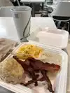 1 scoop of eggs, I small scoop potatoes, 2 strips of bacon and coffee. 12 bucks. Eggs were not hot. Potatoes and bacon were cooked ok. When you look at the portion size, even for airport food, I'd go to Pascals over this place every time.