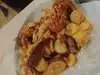 We almost walked out, because from the waitperson it sounded like the choices were spicy to extremely spicy. (I like hot, but not my partner.) In fact, there were some great friend options that were delicious (loved the calamari). Some of the best potato salad ever. Good pickled vegetables. And the clams with garlic sauce (along with sausage) I got weren't that spicy after all...although I reeked of garlic for hours after. (But it was worth it.) Also a full bar and good selection of draft beers...I got an organic IPA that was terrific; my partner a Dogfish Head belgian-style beer (Namaste, I think).