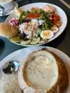 My husband chose this as his birthday lunch spot, partly because he wanted to buy a handmade wallet at Marakesh Leather in the market. We hadn't been there in years, and it was fun on a quiet Tuesday, even with a grey view. We sat on the 2nd floor to get table service, which was spotty if pleasant. He ordered the seafood salad, which he really liked, along with a cup of chowder. I ordered the chowder in a bread bowl, which I've never had before. The chowder was OK, lots of potatoes and a little salty. I enjoyed a chunk of the sourdough bread bowl soaked in chowder (no, I did not eat the whole thing!). But the server brought all the dishes at the same time, rather than the cup of chowder first. So we waited awhile. Then we waited for the check, even though I asked for it before my husband was finished. Good for tourists to enjoy the view, probably won't go back again for years.