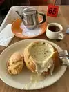 We went on a Friday around 9:30 so it wasn't busy. Ordered the Hangtown Fry which is an omelette with fried oysters. When my meal got to the table it was a warm room temperature except for the hash browns which were good. The oysters were a good size and breaded right and I could tell they crispy when taken out of the fryer. They obviously cooked the oysters ahead and just let them sit around. The clam chowder was not that special either. It reminded my of Progresso New England Style chowder doctored up with some clams added.