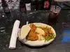 I bought the blackened fish with mashed potatoes. It was delicious. The server was friendly and helpful. I ordered this dish to take to my room and she made sure I had everything I needed before I left.