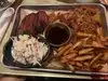 Overall it was very poor food experience. It was $22 for 3 meat platter. I was hungry, so I said to my family member that I would just eat 2 bites of everything. That was nearly impossible because we received 1 sausage that was warm, 4 thinly sliced very small pieces of beef, and a very tiny chicken leg and thigh. I thought it was a kids meal. Typically you get enough to stuff yourself and then more to take home. There was only enough for one person to eat. So my family member graciously shared 2 bites with me and I think that was only because it tasted so yucky. The chicken was tiny & off- putting taste, the sausage should've been crispy and hot and maybe that's why it didn't taste good. The meat slices were good, but there was only 4 tiny pieces. We received a cup of potato salad which tasted like it had been in the fridge for 10 days, I liked it but my family member was very disappointed and he worked in several upscale restaurants in Las Vegas, Casa Del Matador, and a couple famous chef places. If he said it was gross, there's some truth to it! I will never return unless you up your standards and stop serving kid meals for $22.