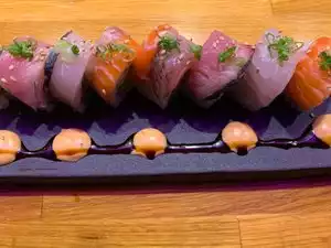 Really good ambience, loved sushi on swing. Good service and flavorful sushi. Forgot names of sushi, but the green on top was chili.