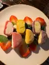 Mono Mono has turned into the my go to place for a good dinner. I love the ambience of it's dark walls and high ceilings. The tables are made of a gorgeous deep wood and the hanging records and floor to ceiling bookcases of them make the place sound and feel hip and trendy without being pretentious. The DJ roost peers over the restaurant; like a lord surveying the lay of his land as his crafts the vibe of the restaurant. Overall, Mono Mono has succeeded in giving itself the look of a jazz and piano bar while serving up an amazing array of food and drink. The biggest draw here of course are the bon chon korean fried chicken wings. They are SO good. Crunchy (in almost a fluffy kind of way) without being too oily and full of flavor and juciness. My favorite is the soy garlic sauce chicken. They are well worth the wait and I prefer these wings to the ones in overpriced Korea town. Since coming here for their wings I no longer desire American buffalo wings. The pickled radishes that come on the side offer a cleansing taste to the mouth that helps to cut through some of the oiliness that results from the fried chicken. Pork buns - Very tasty though the bun is a little too oily to me. I still order it though as the sauce inside is quite lovely and I'm a sucker for pork. Sea Bass - Comes in a SUPER tiny portion (and expensive!) but is DELICIOUS. It is buttery and has an amazingly smooth texture to it. Just thinking about it makes me salivate JUST a little. Having it is a gift of a taste experience. Make sure you have other things coming your way or you'll be hungry still. Jap Che - Very good and HOT! (In temperature) I wish the portion was a bit bigger. Seafood Fried Rice - Awesome. Great with the wings if you're asian like me and love your fried chicken with rice. Also delicious on its own. The sushi rolls are very creative and satisfying. I recommend all of them and the portions here are generous. Grilled corn on the cob makes for great side to anything that might not feel filling enough. It is not your average ear of corn! Fries - another satisfying side that comes with some delicious sauces. Ramen - good and satisfying and well priced to boot! And of course the BAR! Mono Mono crafts up some deliciously creative cocktails made from their homemade infused soju. The jars of soju soaked fruit on the walls sometimes rotate in for months before being served. And because soju lacks that bitey alcoholic taste, all the cocktails come clearly tasting as well crafted as they are. This place is truly a favorite stop of mine in the East Village. I haven't been disappointed yet by the helpful and accommodating staff nor the food and drink here.