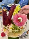 My friend and I went here to eat lunch. She had been here before, but I had not. We were greeted and seated. First off, the restaurant is just beautiful with its open kitchen areas, two bar areas, restaurant seating with a lot of light, and the woodwork is divine. It appears that they have a community dining table, too. My hat's off to the architect/designer. Loved seeing the gleaming silver covers (to cover the food dishes) on the kitchen ledge. We enjoyed a glass of chardonnay and some rose before ordering. The soup of the day was a cream of mushroom and it was beautifully presented, served very hot, and it was downright delicious. I am not sure what type of real mushrooms were in the soup, but they were wonderful. (I have never met a mushroom I did not like.) I had the appetizer shrimp ceviche which was, also, beautifully presented. Very tasty and quite spicey. My friend had the smoked chicken sandwich that came with fries. She said it was wonderful, and we shared the fries which were very tasty. Our server was Alberto and he was most attentive and took care of our every need. He told us about the chocolate ice cream, which we are sure was heavenly, but we passed and will have to go back to try it. We also saw a beautiful sorbet dish being delivered to another customer's table. Note that the sizes are not American size (which are way too big anyway), but French size (why do you think the French are not obese like Americans?).