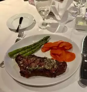 It started off bad as my friend commented on Cesar salad for 26.00 and the waiter took off. We split the special which was a bone end and it was excellent. The potatoes had spinach in them—outstanding. We slit a desert with deep fried apples and berries plus ice cream. It was ok. The waiter recommended a wine. Cost 66.00. It was outstanding. Total bill was 140.00 plus a 30.00 tip for a total costs of approximately 170.00 I considered it a good deal.