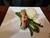 Our family of 5 was quickly greeted and seated. The waitress was friendly and knowledgeable about the menu questions we had. I ordered the grilled salmon, with mashed potatoes and asparagus. The meal came in a timely fashion and tasted delicious. So points for the main attraction. Two items that could be improved are: 1. Bathrooms were untidy, it was about 8pm. 2. They seem to have a work room in the center of the restaurant and dishes were clattering for some time. It was hard to relax until that stopped.