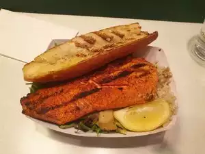 Salmon was fresh from Eliot Bay...simply grilled with spices and served atop a very fresh French roll, from a bakery in the marketplace. Coleslaw, was great...affordable prices. Great street side patio, to do some serious people watching. I am craving the salmon as I write this review! I'll definitely be going back!