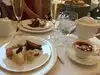 A beautifully decorated room with outdoor garden and attentive staff. But, though the food looked pretty, portion sizes were so small (intricately put together) that one could hardly rate the taste due to small portion sizes--most sandwiches, desserts could be downed with one bite! The smoked salmon sandwich should not have even been considered as one of the "sandwiches." It was a 2-inch straw width piece of zucchini with a drizzle of salmon paste down the middle and 1 caviar egg at each end. Since the price of the full tea has almost been doubled recently, we thought that perhaps we would leave the restaurant at least feeling like we had had lunch. Too many small desserts and not enough (or large enough) tea sandwiches. The half-dollar sized scones, cheddar biscuit, and blueberry biscuit were very good--but, once again--too small to really enjoy. If you are going out with friends and enjoy a beautiful atmosphere and don't mind paying a high price for it, then go here. If you are going out with friends and are hungry for a great lunch, then go elsewhere.