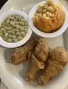 We ordered the chicken , Mac and cheese, sweet potato, chicken and dumplings, fruit, fried okra , green beans, pot licker soup and peach cobbler ala mode.