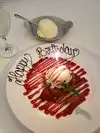 Husbands Birthday Dinner. We arrived around 6 PM no reservations but was seated promptly. Nice table with a view of City Center’s expensive shops. My husband had a fish that I had never heard of. My daughter had steak and me the Sea-bass.. Everyone said their food was ok. The nicest part of the evening was a complementary desert beautifully decorated with his age. We ate here years ago when they served lunch and we had a great experience but they no longer serve lunch.