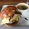 Started with the deviled eggs- - They were good and a bit spicy -- a variety pack: pepper relish, pickled jalepeno, tuna salad, anchovy, seared scallop, seared octopus -- they were good, but didn't expect all the seafood. Next up we had a Fishwich, which was disappointing. The bread overwhelmed the fish and the fish was very thin piece. Overall it was bland. The cream of broccoli soup was very good -- the croutons really added to it. We normally delete croutons from soup orders, but the waitress insisted and she was correct. The porkstrami is the sandwich to get. Very good and flavorful. The maple bread pudding was decent for dessert -- the cinnamon ice cream is what made it, made for a nice combo. The waitress was wonderful. Nice views of the market area and bay.