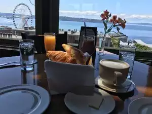 It had the potential of being a great brunch. Conveniently located in Pike Place Market, with a beautiful view of Elliott Bay and Puget Sound. Food was pretty good (but overpriced). That is all we have to say that was good. Now for the bad part... Our waitress was terrible. Not only was she rude, she was inattentive. She started by belligerently telling us we were not allowed to bring outside drinks (coffee) into the restaurant. Funny, but the host did not share this sentiment. She was very slow to wait on us and quite rude when doing so. She never checked on us after food was delivered - we had to ask for butter for our $8 croissants. Also, I never got a coffee refill. It took quite a while to get, and pay, our check. After, we waited too long to have our "outside drink" returned to us. When she did, she slammed it on the table and walked away. We will be happy not to return here. Suggest you look elsewhere also.