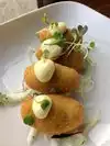 We recently visited and tried five of the tapas: the tomato bread, the shrimp, the octopus, the croquettes, and the flatbread. Some of the tapas were incredible—the croquettes and shrimp were great. The shrimp was not only delicious, but came in a generous portion for a small plate. The croquettes melted in your mouth, and the aioli and garnishes added a bit of flair to a classic tapas dish. The other dishes were good, but fairly standard. I had the house gin and tonic, which was a really great drink. The garnish of rosemary was a great touch.