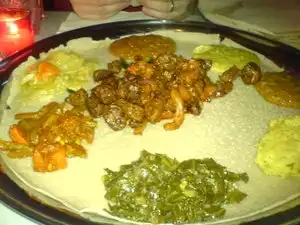 Be prepared to enjoy the entire meal with your hands (breaking off pieces of the Ethiopian bread to scoop up the foods). First timers may want to order the combination platters, both meat and vegetarian are very good. For meat eaters, order a variety of meats (beef, chicken, lamb), supplement with a vegetable dish or two. You don't need to save room for dessert, the restaurant does not offer desserts.