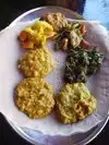 My first Ethiopian meal. Starters were sambosas (same as samosas) tiny but quite enjoyable & the wonderfully named Timatim Fitfit : injera - a huge (15" diameter ?) flat pancake wrapped around various dressed salad - quite refreshing With the main courses, we did not fare so well . Another huge pancake with both main courses arranged on it The special tibs - lamb & peppers was good. The combo was very varied . Some of it extremely unattractive - like someone had placed dollops of vomit or worse around the pancake. (Just as well the restaurant was very dimly lit) Mostly it tasted ok It was served with - you've guessed 2 extra pancakes. Service was friendly & efficient