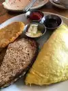 Waited just a few minutes to be seated at the bar by the shellfish. We were not happy as a clam there! Do Not sit sit there...waited another 15 before anyone came over. Started with the Stumptwon coffee (3.50) and the peach muffin ($4) smallish size - not into the Costco size, interesting taste (almost like a chai) but I would say leave it. They are generous with their coffee, someone does come by, once they see you, every few minutes. The New Mexico green chili omelette for ($10) was tasty but the potatoes that they said were to die for, would not die for. Description should be more, made with onions and peppers and a dash of salt (not to due for). Should have ended with the omelet, but moved on to the challah french toast ($14) they do have one slice for ($7) it was coconut crusted. If you do go get a slice. The sports playing on the TVs overhead is a draw for some and the barely heard Motown music, nothing to absorb sound makes it incredibly loud. The atmosphere is more like a kid's camp, adorning the walls are a canoe and metal mess hall serving trays. I think I won't be messing with this place again. You can pay for valet parking or go two blocks and park for free.