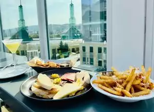 This is a unique venue on top of the Best Western by the Convention Center. The atmosphere and views from the venue are incredible; this is definitely a great place to be, and to relax. I went here on a late Saturday evening. The staff here was very friendly during my visit. With that said, service was slow; one beer and a dish of hummus and veggies took an hour and a half from start to finish...it was 45 minutes from my time of order until I received my food. And it was definitely hotel-price expensive! That aside, the dish was excellent...the hummus very good, lots of veggies, and excellent flat bread. And while my server was very friendly, she was very inattentive, taking a while to check in, and fill my water....maybe because I was a party of one during a fairly busy period. All in all, this is a great venue, and worth stopping by...just don't expect a "quick", or cheap, visit.