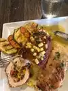 Red snapper was fresh, topped with cherry tomatoes and gulf shrimp in a savory garlic sauce. The sides were plank style grilled fresh veggies. My wife had the spinach salad, a pretty boring choice but she said it was very good. My daughter had the chicken kabob and my son had the chicken stuffed with spinach and goat cheese which was out of this world good. The atmosphere was nice but relaxed. The waiter was attentive but a bit awkward. I would certainly suggest this restaurant if you are a fan of Mediterranean flavors.