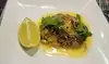 Food was wonderful! Hummus was delicious and a bit of spiciness. For entree we had risotto with shrimp, crab meat, and scallops. Very good. Service was fantastic. Very friendly. atmosphere was great. We will be back. Cappuccino was good at the end.