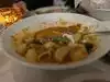 It was a chilly rainy night. We stopped in for dinner and some wine. It was delicious. We all ordered the same thing too which is highly unusual for us. We had a half moon pasta dish with a tomato cream sauce with prosciutto, onions and peas in it. We had some flavorful Parmesan chased on top. It was amazing. Just the perfect meal on a rainy Sunday evening.