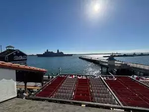 We started a tab and stayed for about an hour and a half. We ordered a few beers, the chips, and guacamole, carnita taco and fish taco. I don't drink so I ordered a lime soda water and it was a Kirkland's canned water. You get a number after you order downstairs. We headed up to the upper deck and watched the naval ships. The huge USS Anchorage came through as we were eating. It's a great place to stop and have food. It's in the Seaport Village so it's among many shops, eateries and ice cream stand. The bathrooms are accessible in the Seaport Village area. Our total was about $84 for the 2 of us. We had a Big Dog (hot dog wrapped in bacon with jalapeño cream sauce, Hawaiian Choirzo taco, Fish taco, chips and guacamole, 3 Hazy IPAs, and a sparkling Kirkland lime water).
