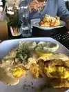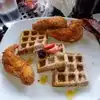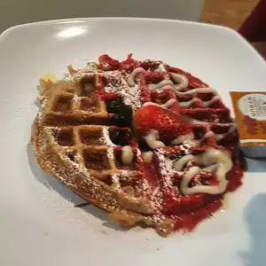 The food was good I’ll say that, but the chicken tenders were extremely salty. I had the smothered chicken & biscuits while my friend had a red velvet waffle with chicken tenders. We both experienced this lip numbing saltiness from the chicken. That was the only con! The biscuits are delicious and fluffy, the red velvet waffle is extremely flavorful and not to sweet. The staff is helpful and friendly which is while I know we will return and try other dishes.