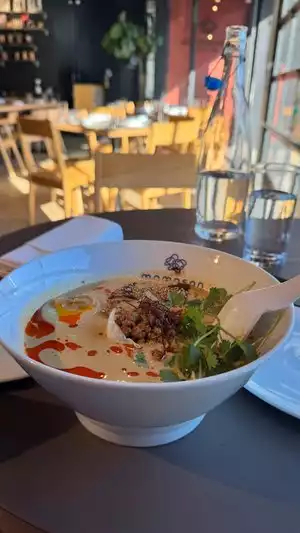 My friend chose this place when we arrived in the area where this restaurant is located. Surprisingly, there was absolutely no one there after lunch, and we had lunch together in a cozy place. We ordered several dishes for two to share and were pleased with the ramen and Korean dish. The Peking duck seemed to us not as familiar as we order it in other places. Not enough cucumbers and onions and the flatbreads were not very tasty. Otherwise - good location, nice place, polite service. I recommend