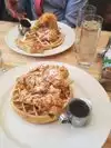 My husband and I are always looking for new spots to try when traveling. He found this location and after reading the reviews we decided to try it. Parking is extremely tight. Some had to park on the street and even up the street and walk to the restaurant. There is inside seating, outside seating, garden seating and bar seating. We arrived and was seated right away-on a Saturday after 11-but the crowd arrived shortly after. I had the chicken and waffles. The waffles was tasty-the chicken strips i was a bit disappointed because there was no seasoning on the chicken but there was a nice light batter to them. I had the strawberry lemonade. My husband had the frenchman sandwich and he had the coconut lemonade. The service was nice and quick. Loved eating outside. There are fans outside and a cover for outside eating.