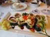 The atmosphere was good, the taste was good and the staff was kind. They even gave me chopsticks, thinking I was Japanese. Assorted. I asked for half of it, I asked for a salad, I drank wine, but that was enough.