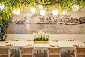 excellent food, atmosphere, ambience. fyi hummus comes w pita (note there are also pitas for sale w toppings). the food was a bit overpriced and watch for the 20% tip plus request for more.
