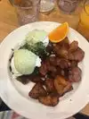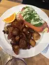My husband and I got to the "cafe" recommended by the hotel to have breakfast with our son and daughter who were walking there, and they were running 5 minutes late. We were told we could not sit down and told to wait outside. It was rather cold and very windy, so we insisted and were told to sit at a tabe for 2. The table next to us, for 4, was free. My husband and I ordered already, so we could drink a coffee (horrible). When our son and daughter arrived we were told - in a rather unpleasant manner - we could not move tables and they had to go sit elsewhere. "you cannot move tables once you have started". The food arrived, gigantic portions, mainly due to a heap of deepfried unhealthy greasy potatoes and the lot covered by a thick coloured mayonnaise. My husband and I ordered a different dish, but we were both rewarded with a vast amount of unhealthy greasy stuff. not a place for healthy people...to say it mildly.
