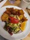 Get here early: we arrived at 8 and it was already busy but by 10 am they were queues down the block. Lots of choice for breakfast and brunch - we enjoyed the scramble options and the hash brown which comes with this is lovely. Interesting and eclectic breakfast choice and big plates.