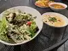 Uber delivery. Took a while, but apparently that was an Uber issue, not a restaurant issue. Three salads and a tomato soup. The soup is delicious, tasted homemade in a good way! I had shrimp salad with arugula and some feta and avocado. Great choice! My wife had the salmon salad and enjoyed it. The other salad is for tomorrow and it’s somewhat of a chopped salad With chicken, I think. Very pleased with the order and this place. Tasty food and decent value.