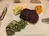 Very noisy, steaks are super larger without much flavor, creamed spinach tasted horrible - my test is when I don't eat the food, I want to see if the server will ask if everything was ok. Our server did not. Our dinner for 2 with a bottle of wine was $500 and we had to ask for bread -- which was awful. The bring out large, raw steaks on a platter to EVERY table and the server had his butt in my face while he showed the teenagers next to us their "high-end" steaks. Why not ask if I want to see them? The steaks were all for 2-3 people. It seemed to have a circus atmoshphere with candy cotton and a sparkler as their "fancy" dessert. Go to Ruth Chris!