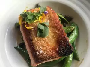 Just finished an awesome dinner at noble rot ( the restaurant). The claim to fame for this wonderful eatery is a lot of the veggies and. Herbs used in their food is grown on the roof of the restaurant. I had the roof salad which featured salad greens, flower petals, and squash. Main course was perfectly cooked king salmon. My wife had the fried chicken was moist and very tender. Awesome meal. The restaurant is open 7 days a week, and the cost for two was $100 for two. We'll worth the money. We took a taxi from the pearl district and the cost was $11. Easy access from the transit or a little 1.4 mile walk from city center.
