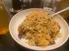 Husband and I wanted to go to this restaurant since we saw it while checking in! I felt bad because they were short staffed and there was one lady manning the front and the to go orders. Props to her for holding down the fort and getting us all seated in a decent amount of time. We were not aware that the players sizes are shareable. We shared the vegetable potstickers, which were delicious. I ordered vegetable fried rice (pictured) and my husband ordered Hong Kong beef egg noodles (pictured). It was very good! Well worth the wait!