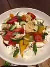 We had lunch here last week and enjoyed our chicken salad and vegetable bowl salad. Nicely grilled chicken and warm to the touch. Didn't like the uncomfortable outside sitting chairs. WE decide to come back later in the week to have the same dinner salad with chicken but ......... the chicken was cold and chopped up and mixed into the salad. No bowl but served on a plate with less of everything. Had to complain to the waitress and asked, Why ? Because it's dinner time and portions are smaller then. Really ?? Makes No Sense. I had texted my friend , who's an Italian chef and complained to him and he said, he's heard of the same complaints from friends. There you go. All it takes is one bad experience and the wife will NOT come back here again.