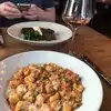 We came here on a Friday night at 6:15. Without a reservation our options were a patio table or bar spot. We decided to accept the longer wait for the patio, which was estimated at 1.25 hours. We walked around for a bit then had some wine at the wine bar next door. The patio never opened up (lingering folks enjoying the Friday night weather) so they then offered us the chefs bar. Glad they did because it was so fun to watch all the action! Now for the food- my shrimp ravioli was fabulous. I don’t eat cheese and they made sure not to add it in any way. I appreciated the care. My husband ordered the pizza with crab on it and loved his as well. I would say this is $$$. Great wine list, cool atmosphere delicious food.