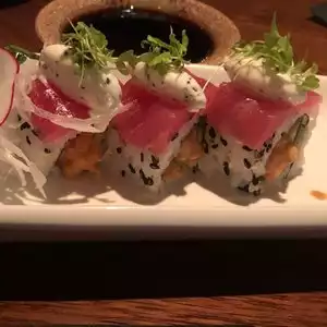 Great little understated sushi bar. Just terrific service great sushi. Very well priced. Five sushi chefs kept it coming and a good happy hour too. Can’t go wrong.