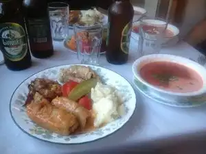 Cozy space, with few tables. Has a bar and delicious authentic Ukrainian food. Locals and visitors have been eating here since the 1980's. Wonderful pink borscht with dill and sour cream garnishes. Other soups, chicken dishes, mashed potatoes, mushroom sauce, cheese nalysnyky, cabbage rolls, multiple salads and fresh fruit, e.g. watermelon, available in season on buffet. Quiet un-obtrusive service. Cash only.