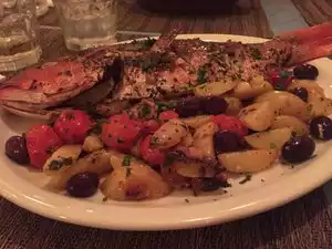 Lots of good here. Small and authentic. Bring your own wine with No Corkage fee. We had the whole fish of the day... terrific. Service can be slow, and the place can be crowded, but heh. It's at the beach and the food is worth it. Bring your own, and be amazed at the reasonable price of a good meal.