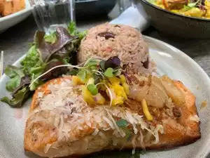 I wanted to give this spot five stars. The vibe, the ambiance, the staff, the clientele, all FIVE STARS. The drinks, four stars. The food—at least the food I had—was not great, to put it nicely. This is a laid back venue that serves Caribbean/Jamaican inspired food, as well as rum/tropical drinks. It plays great music—r&b, hiphop, island music (sorry, I don’t know the right term). The patrons are lively. The service is attentive and down to earth. The decor is very cool. My food was what tripped me up. I got the coconut crusted salmon with a small salad and mushrooms. The salad and mushrooms were forgettable. The salmon was just plain bad. There was a congealed substance on it and it didn’t seem fresh. Now, I probably just messed up and got the wrong thing. Their oxtail, jerk chicken, and some of the other dishes I saw coming out of the kitchen looked much more palatable. I expected my drinks to have a little more flavor, but they were decent, and served with a smile. I would try this place again, simply because I think it’s my bad for choosing the salmon. And again, the people running this spot are AWESOME!