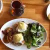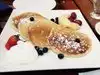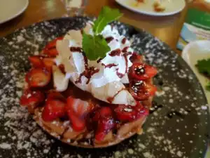I highly recommend this cafe. Breakfast was an omelette with feta,onions and mushrooms. It was delicious and fresh. Not at all greasy. Also the waffle served with grapes, watermelon and pineapple slices and a strawberry with whipped cream was to die for. Crisp on the outside, soft and fluffy on the inside, like all waffles should be. The maple syrup wasn't really needed but was nice addition. Our friend had a spicy sausage omelette and was thrilled with it. We also had desserts! The tiramisu was the best we've had, the mixed berry cake, was like a fresh mixed berry tart. Crust was delicate, with a thin custard layer to keep the whole slice moist, followed by heaping mounds of mixed berries - mostly raspberry, blackberry, and strawberries and blueberries. It was so fabulous I wanted to take the whole cake home. Our friend had the triple mouse cake, which I thought was the least perfect of the 3. The chocolate was dark and rich, contrasted with a light chocolate and white chocolate mouse. I felt as though the dark chocolate was over powering. All in all we loved this place!