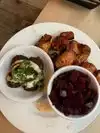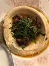 This restaurant has hummus bowls with a variety of toppings. I got the roasted cauliflower topping with golden raisins and thinly sliced almonds - Delicious! Everyone got their own bowl. This was really too much food. I suggest you either split a bowl or get several bowls and share. One bowl has enough food for at least 2 people. It's a lot of hummus! The restaurant has a great atmosphere and the service was great!