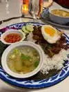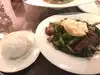 Patio dining available. Friendly efficient service. I had Volcano Beef which was flank steak cubes in Thai sauce topped with 3 crispy onion rings. I added sticky rice and Thai chili sauce. Very flavorful.