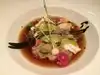 Full review and photos: http://twofoodiesonejourney.blogspot.com/2012/02/dining-room-at-ritz-carlton-san.html Travel time – the best time to indulge in one of our favorite hobbies. There is hardly any day when we don’t talk about our next potential trip, and for us arranging and planning a journey is already part of the fun. First we will have long discussions where we should go next going back and forth between new destinations we haven’t visited before and revisiting places we liked a lot but never feel we have visited extensively enough. Once we decide on a place the next question circles around how we will get there – driving/flying directly or should we travel slowly with several stopovers to get to know even more locations. But the most extensive planning is always around the time at the destination itself. Starting with finding the best hotels and reading many travel review pages the most time is spent on finding the most unique points of interest and best places to eat. There are many different ways to explore the culinary scene of any city – starting from discussion boards as Chowhound and eGullet, local newspapers to the numerous food blogs every part of the world seems to have by now. And so it is rather easy to come up with a very long list of interesting restaurants covering a wide range of cuisines for every city, but the hard part is to decide how to prioritize this list to make a final decision on the restaurants. As much as we like to explore new places there are a few cities we visit quite regularly – Los Angeles and Las Vegas are fairly close to San Diego and we go to them, especially Los Angeles, many times every year. One city which isn’t as close by but we really started to enjoy the moment we visited it for the first time several years ago is San Francisco. Over the years we kind of lost our heart to San Francisco and hope to live there at one time but until then we try to visit the city at least once a year. There are many attractive features about San Francisco far beyond just food but the vast culinary scene of the city has always attracted us and makes the selection of the restaurants for each visit fun and painful at the same time. We always try to find the right balance between the many different ethnic restaurants often with unique regional places, e.g. diverse Italian restaurants from different regions, old-established places, like Chez Panisse and high-end places with unique tasting menus. On one of our last trips we were contemplating a number of places with more conventional tasting menus to add to our mix of restaurants for that particular trip. Some of the restaurants we were considering were Gary Danko, Campton Place or Murray Circle but in the end we decided to go for the 9-course tasting menu at the Dining Room at the Ritz Carlton. One of the aspects which attracted us to the Dining Room at the Ritz Carlton was its chef Ron Siegel. He has a quite interesting and impressive background with many diverse influences throughout his career covering several well known and influential mentors. Born in New York he moved as a child to San Francisco and started to work as a butcher at John’s Town and Country Market in Palo Alto when he was 16. During the next several years he worked at several different jobs outside of the culinary world like construction and maintenance but finally decided to focus on his culinary passion and enrolled at the California Culinary Academy. In 1991 he found his first mentor with George Morrone, opening chef of Aqua, and worked under him for two years as a line cook. Morrone was also responsible for helping Siegel to find a position at Daniel in New York under the guidance Chef Daniel Boulud. It was here that he met one of his key mentors with Thomas Keller who was in the process of opening the French Laundry and hired Chef Siegel as the opening sous chef. The successful start of the French Laundry facilitated his first position as executive chef at Charles Nob Hill focusing on the fusion of French and California cuisine. After five years he moved to Masa’s in San Francisco as the executive chef before in 2004 he took over the Dining Room at the Ritz-Carlton. Throughout his career Chef Siegel had a strong foundation from French cuisine which he combined with different other influences. Perhaps the most unusual one, Japanese, came through the one event which made him famous far beyond the close circle of foodies – becoming the first US chef in 1998 winning Iron Chef Japan in a battle using lobster against Iron Chef Hiroyuki Sakai. All these features combined let us hope to be in for an exciting and unusual tasting menu at the Dining Room. The restaurant is located inside the Ritz-Carlton Hotel in San Francisco which opened 20 years ago but is located in a more than a century old building. The hallways inside the hotel towards the restaurant are fittingly decorated to match the history of the landmark building. The interior of the restaurant continues the theme from outside and looks very much like a restaurant from the 50s or 60s with very old fashioned décor. Once we entered the restaurant we significantly lowered the average age of the guests... Even our seats had covers which we had last seen in one of the old movies. Overall we weren’t expecting that the Ritz-Carlton and its restaurant would be outfitted overly modern but were still surprised how old fashioned and partly also worn everything looked. Pomegranate Martini and Old Fashioned As always we wanted to start the night with some cocktails but that caught the restaurant a bit by surprise as they didn’t even have a cocktail menu/list but were willing to mix us something. The pomegranate juice gave the martini a good balance between sweetness and some sourness. The old fashioned was one of the better versions we had in quite some time. This cocktail often tends to be unbalanced either focusing too much on the interplay of sugar and bitters or the bou